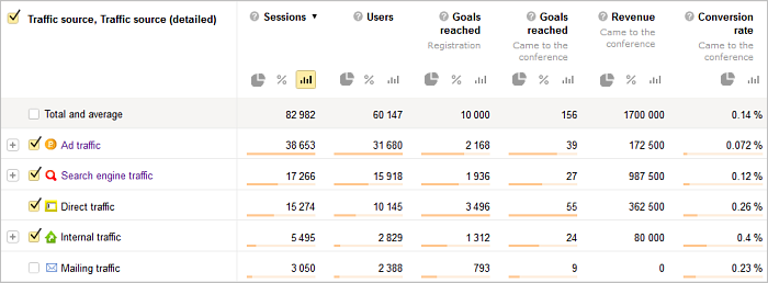 As conversões offline são rastreadas usando objetivos. Você pode usá-las em qualquer um dos relatórios do Yandex Metrica, assim como para segmentação. São calculadas métricas de conversão para objetivos offline (por exemplo, a taxa de conversão e o número de conversões). As informações resultantes ajudam você a avaliar com maior precisão o desempenho de diferentes canais de aquisição de usuários, para que você possa entender melhor como os clientes chegam a uma conversão.