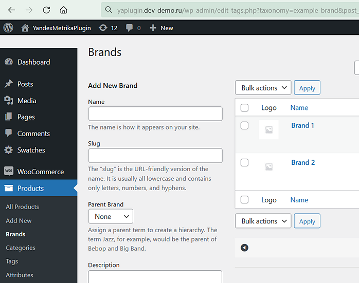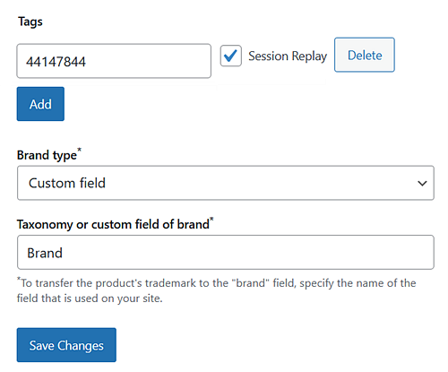 Insira o Tipo de marca para que as informações sobre suas marcas de produto sejam transmitidas corretamente para o Yandex Metrica e apareçam nos relatórios.