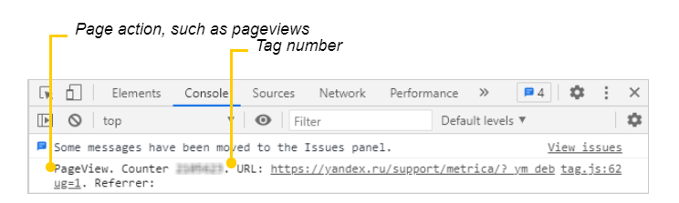 O parâmetro _ym_debug=2 só irá funcionar se o novo snippet de código do Yandex Metrica estiver instalado no site. Se você estiver usando uma versão antiga do snippet de código ou o painel de depuração não aparecer, utilize o console do navegador.