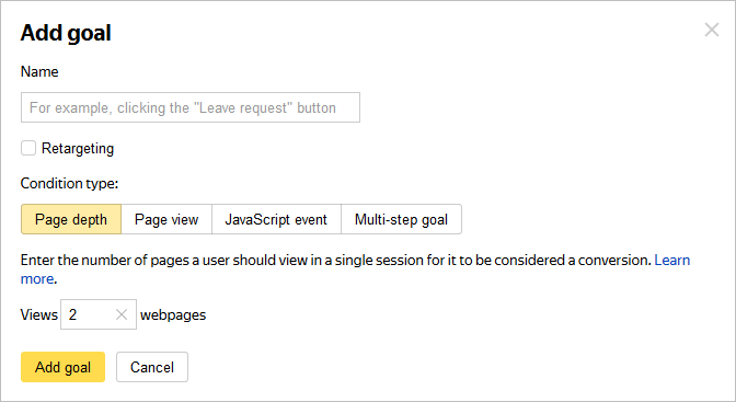 - Clique em Adicionar objetivo. O objetivo criado aparecerá na lista de objetivos. O Yandex Metrica começará a coletar estatísticas sobre o objetivo em alguns minutos.