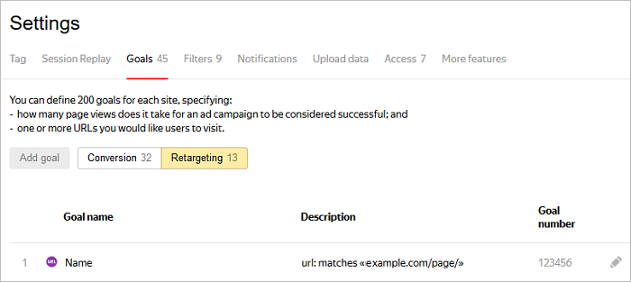 Sempre que um objetivo do Yandex Metrica for especificado nas configurações de uma campanha do Yandex Direct como condição para retargeting e seleção de público, ele será exibido na seção Objetivos do Yandex Metrica.