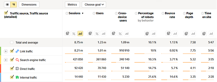 Você pode usar o Yandex Metrica para configurar a atribuição por cliques (por click-throughs). Essa configuração ajuda a precisar a origem do tráfego e a descobrir qual das origens resultou em uma conversão. Em outras palavras, ajuda a determinar as origens mais eficazes.