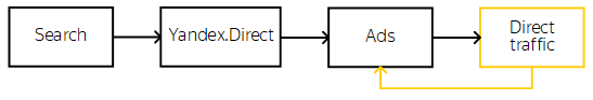 Caso tenha havido tráfego de outras origens após o clique num anúncio do Yandex Direct, todas as sessões são atribuídas ao último clique no anúncio do Yandex Direct.