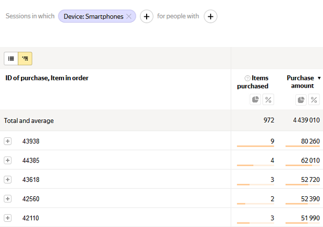 Os dados do relatório são agrupados pela ID da compra e mostram cada um dos itens do pedido. Caso você transfira dados em diversas moedas, é possível selecionar uma delas no relatório. Quando você seleciona uma moeda, os valores das métricas monetárias são recalculados usando a taxa de câmbio da véspera da realização da transação.