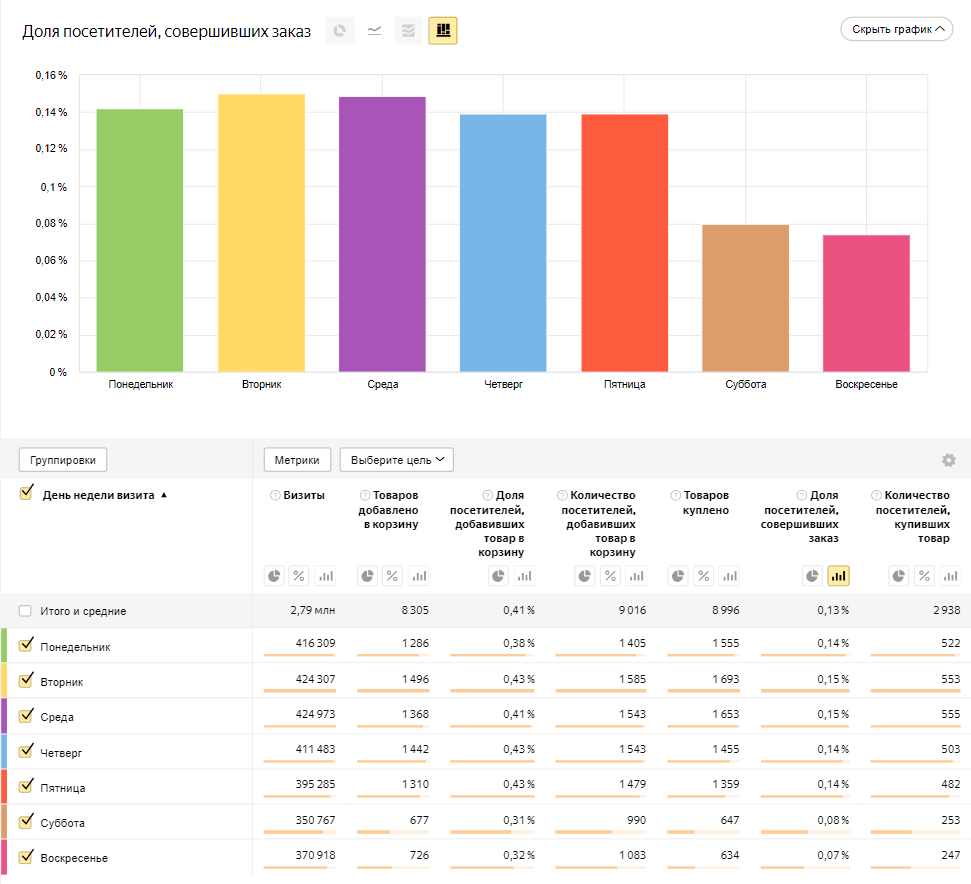 Use este relatório para ver como o comportamento dos clientes no seu site varia de acordo com o dia da semana.