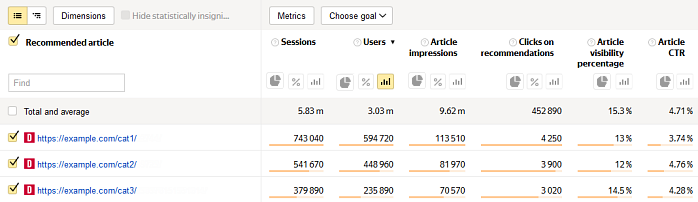 Os dados do relatório são agrupados pela URL do artigo recomendado.