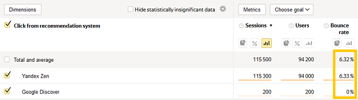 O relatório é compatível com todas as configurações disponíveis no Yandex Metrica.