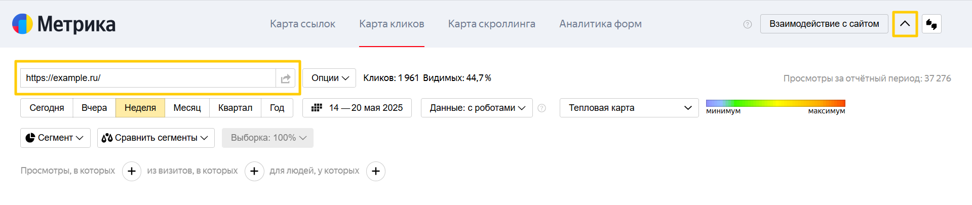 Карта будет отображена на наиболее популярной странице сайта, URL которой соответствует указанному условию. Числовые показатели (количество просмотров, кликов, доля видимых кликов) будут являться объединенными для всех страниц, соответствующих условию.