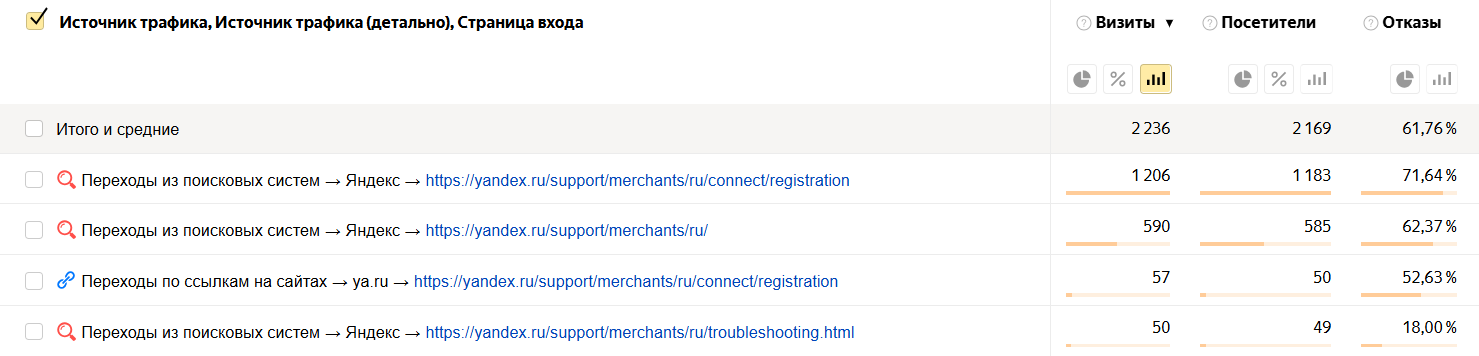 Отчет содержит статистику по страницам, с которых посетители начинают просмотр вашего сайта. Данные представлены только по тем визитам, которые начались с указанных в отчете страниц.