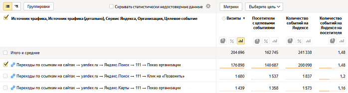 В отчете данные объединены по типу источника визита с детализацией до целевого события. Эта статистика помогает детально проанализировать, какие целевые действия совершают посетители сервисов, связанные с вашей организацией.