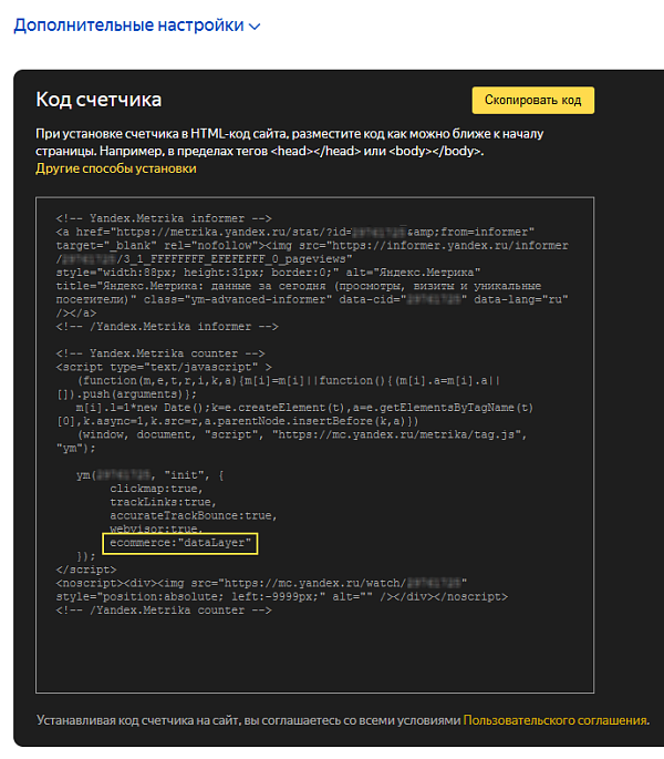 Для этого скопируйте код счетчика. Убедитесь, что код счетчика на сайте содержит строку:ecommerce:"dataLayer".