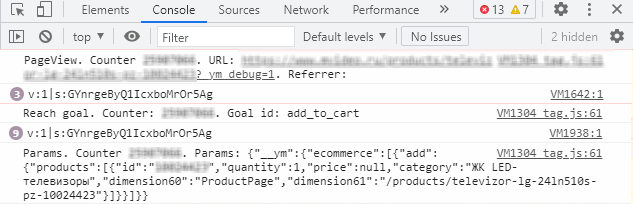 Если в параметрах есть ecommerce, а уровнем ниже add — формат соответствует примеру в событии Добавление товара в корзину, значит данные о заказе переданы в Метрику. Через некоторое время они появятся в отчетах.