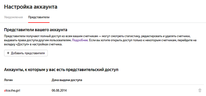 Владелец аккаунта в Метрике может дать представительский доступ к своему аккаунту любому пользователю, имеющему логин на Яндексе. Представитель получает полные права просмотра, редактирования и удаления всех счетчиков аккаунта, в том числе, гостевых.