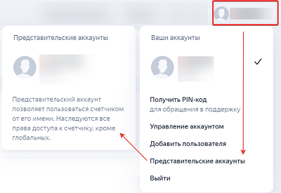 Чтобы переключиться на представительский аккаунт, выберите логин в правом верхнем углу страницы и нажмите Представительские аккаунты.