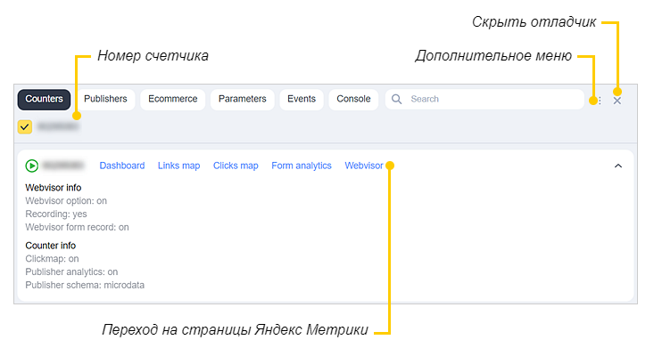 Чтобы закрыть отладчик, откройте дополнительное меню <sodipodi:namedview id="rnd-308b8381__namedview2803" pagecolor="#ffffff" bordercolor="#000000" borderopacity="0.25" inkscape:showpageshadow="2" inkscape:pageopacity="0.0" inkscape:pagecheckerboard="0" inkscape:deskcolor="#d1d1d1" showgrid="false" inkscape:zoom="25.732538" inkscape:cx="14.90331" inkscape:cy="8.5106257" inkscape:window-width="1920" inkscape:window-height="1017" inkscape:window-x="-8" inkscape:window-y="-8" inkscape:window-maximized="1" inkscape:current-layer="i-ua1"/> и нажмите Close debugger. Также отладчик можно закрыть, добавив в URL страницы параметр ?_ym_debug=0.