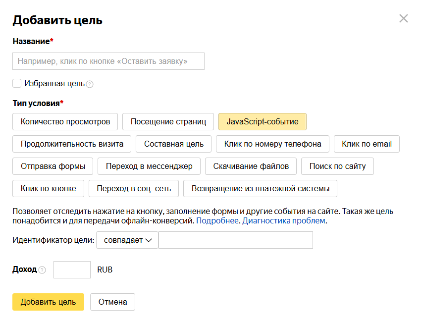 Информация о достижении такой цели передается в Яндекс Метрику с помощью JavaScript. Таким образом можно отслеживать практически любые произвольные события. Также цель такого типа можно использовать на страницах Турбо-сайта.