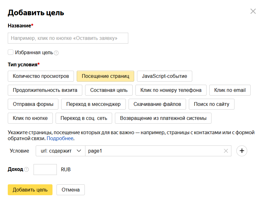 Указывается часть URL. Используйте этот вариант, если целевых страниц несколько, и их можно объединить одним условием. Указывайте как можно большую часть URL, чтобы цель была достигнута только на нужных страницах ПримерЕсли задано условие |