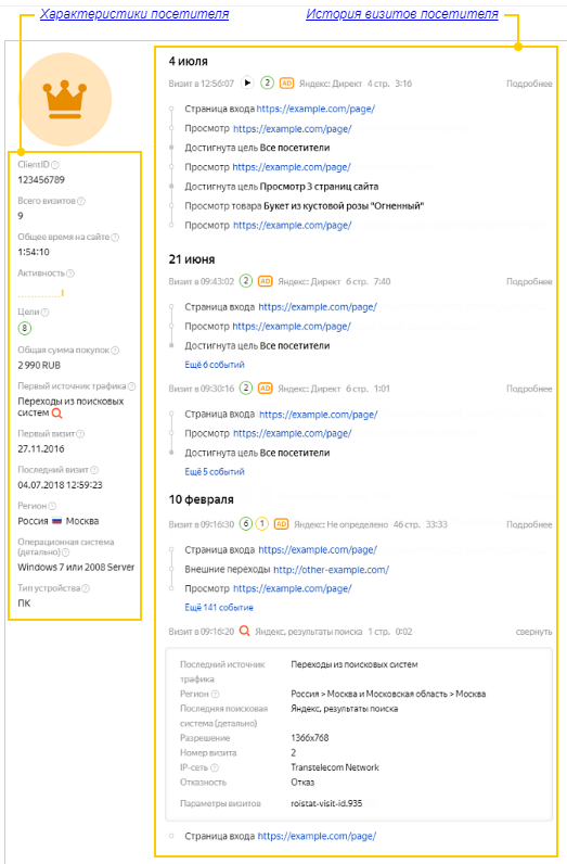 Количество совершенных посетителем покупок и сумма заказа отображается, если настроена передача Ecommerce-данных. Количество покупок и сумма дохода отображается за всю историю визитов посетителя на сайт.