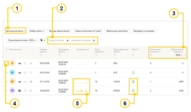 В столбце Цели нажмите значок и выберите нужную вам цель. Нажмите кнопку Применить. Список посетителей обновится.