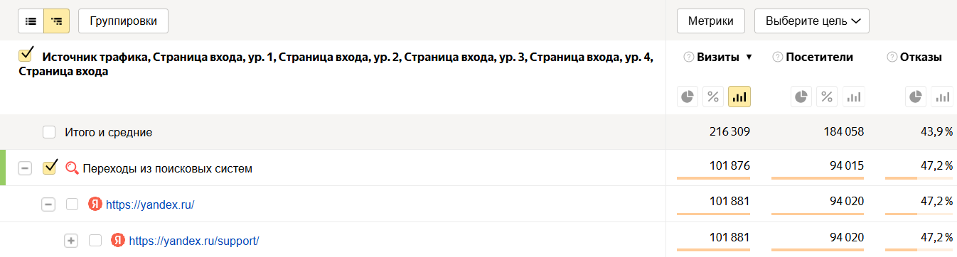 Переместим Источник трафика в начало списка. Видно, что высокий показатель отказов имеют переходы из поиска.
