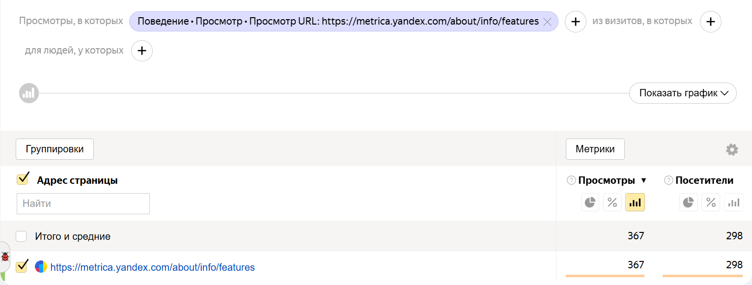 Количество просмотров в отчетах различается. Так произошло, потому что при сегментации по визитам, кроме просмотров указанной страницы, в отчете учитываются просмотры других страниц в выбранных визитах.