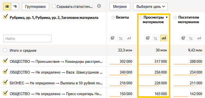 Данные сгруппированы по рубликам и материалам. Группировки вида «Рубрика ур.» соответствуют тому, как размечена вложенность разделов сайта, где размещен материал. Может быть только два уровня вложенности.