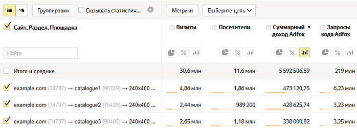 Вы можете отследить доход от показов настроенной в Adfox рекламы, который принес сайт или раздел сайта, а также формат рекламного блока. Для удобства отсортируйте данные по убыванию «Суммарного дохода Adfox».