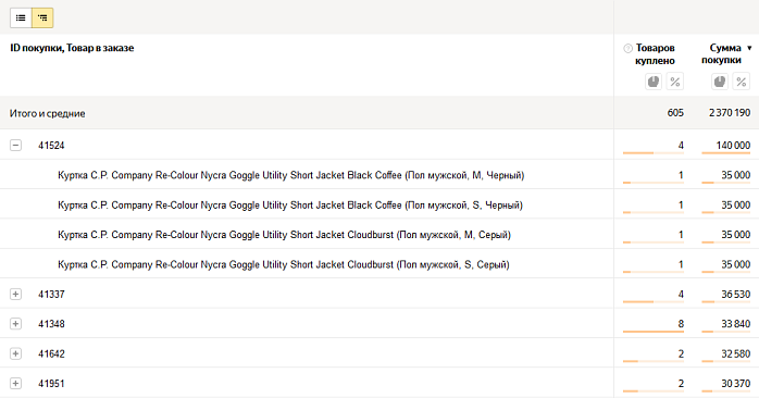 Данные в отчете сгруппированы по идентификатору покупки с детализацией до товара в заказе. Если вы передаете данные в разной валюте, в отчете вы можете выбрать одну из них. При выборе валюты значения денежных метрик пересчитываются в соответствии с курсом конвертации, который был днем ранее совершения дохода.