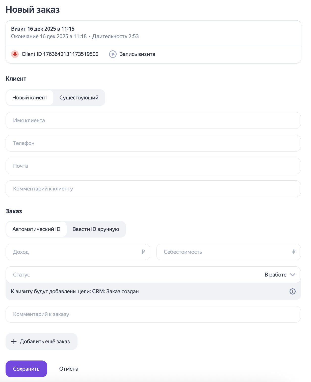 - Новый клиент — создается новая карточка клиента.