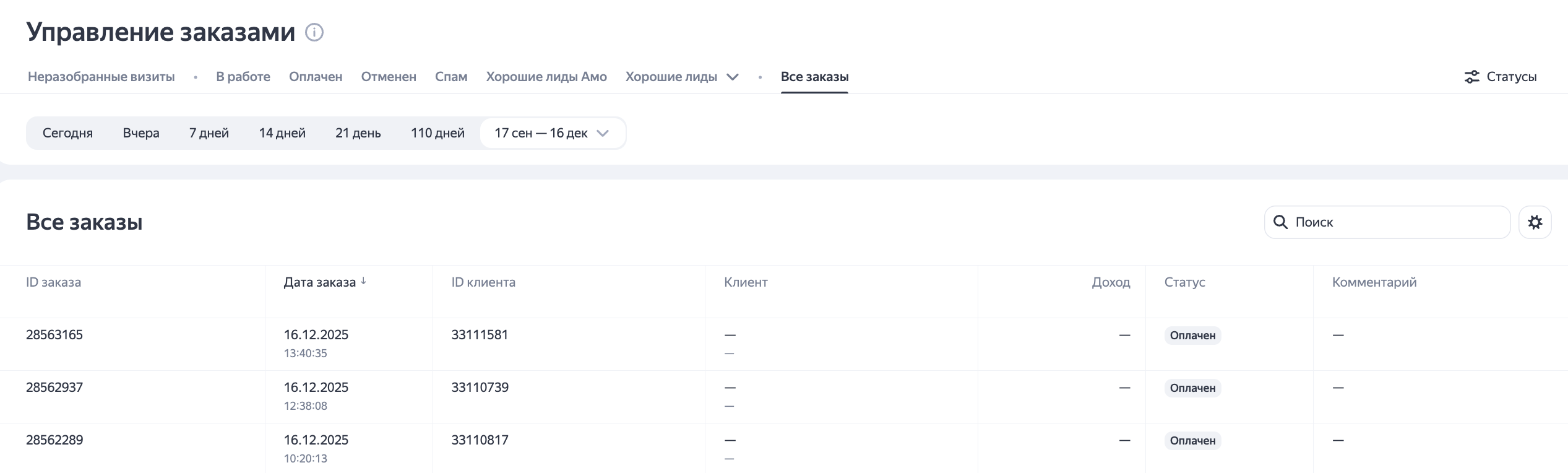 - сортировать заказы по колонкам (например, по доходу или дате);