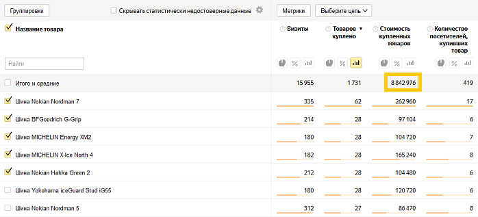 Для формирования отчета необходимо использовать возможности сервиса по учету и анализу данных электронной коммерции — Ecommerce. При первой передаче данных отчет станет доступен в течение нескольких часов.