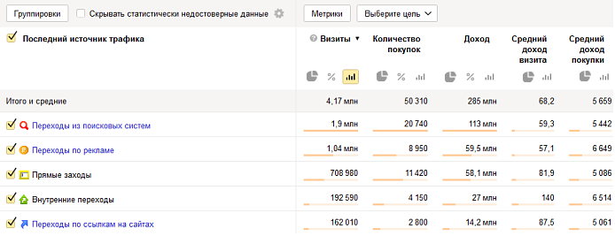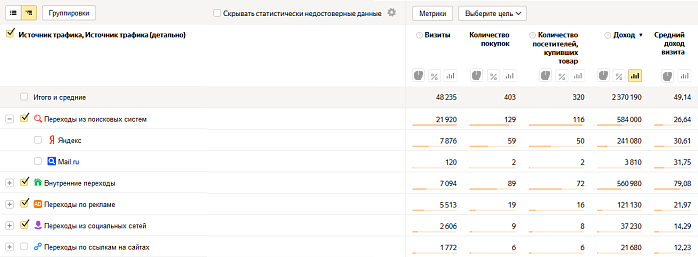 Данные в отчете объединены по источникам трафика. Если вы передаете данные в разной валюте, в отчете вы можете выбрать одну из них. При выборе валюты значения денежных метрик пересчитываются в соответствии с курсом конвертации, который был днем ранее совершения дохода.