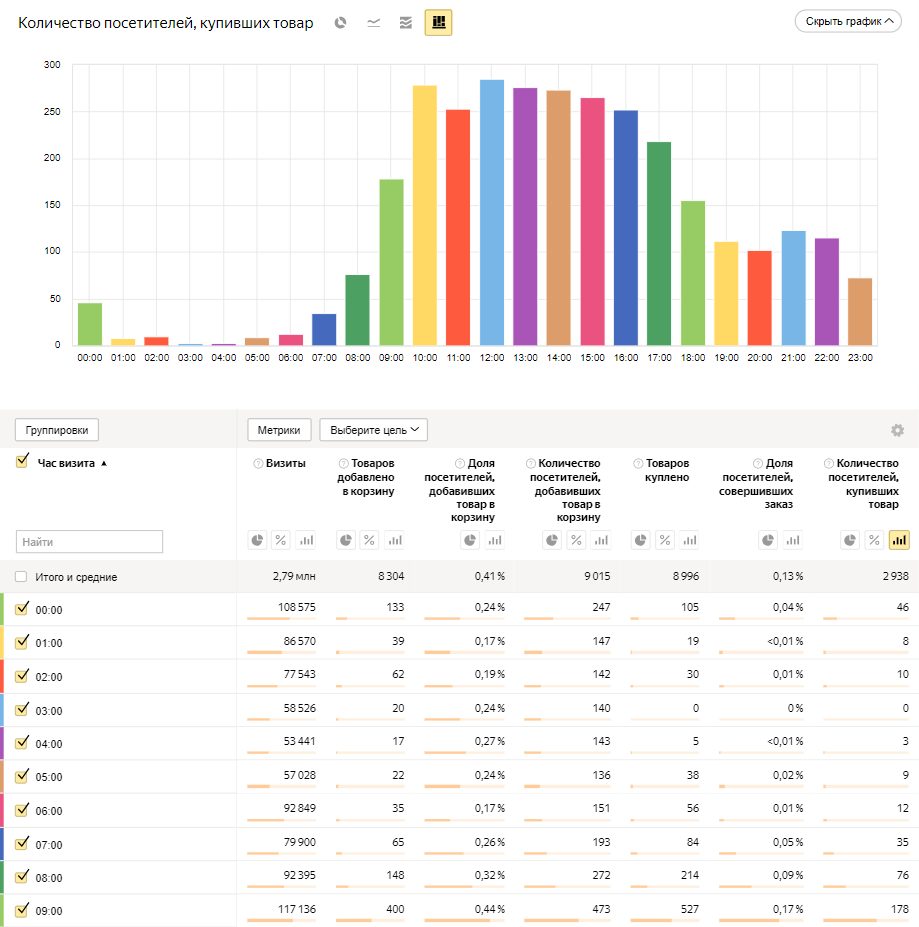 Отчет показывает, как меняется покупательское поведение на вашем сайте в зависимости от времени суток.