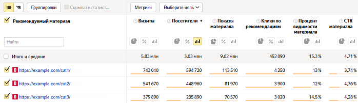 Данные в отчете сгруппированы по URL рекомендуемого материала.