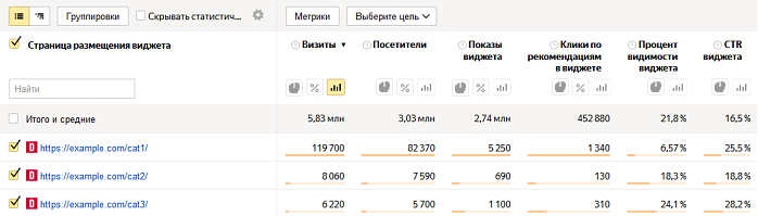 Данные отчета сгруппированы по URL страницы сайта, на которой размещается рекомендательный виджет.