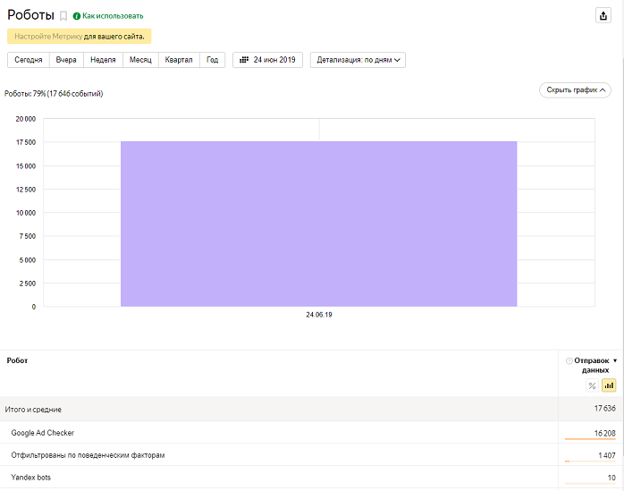 Метрика Отправка данных отображает количество просмотров и других служебных событий (вызов функции hit, неотказ и др.), произведенных роботами.