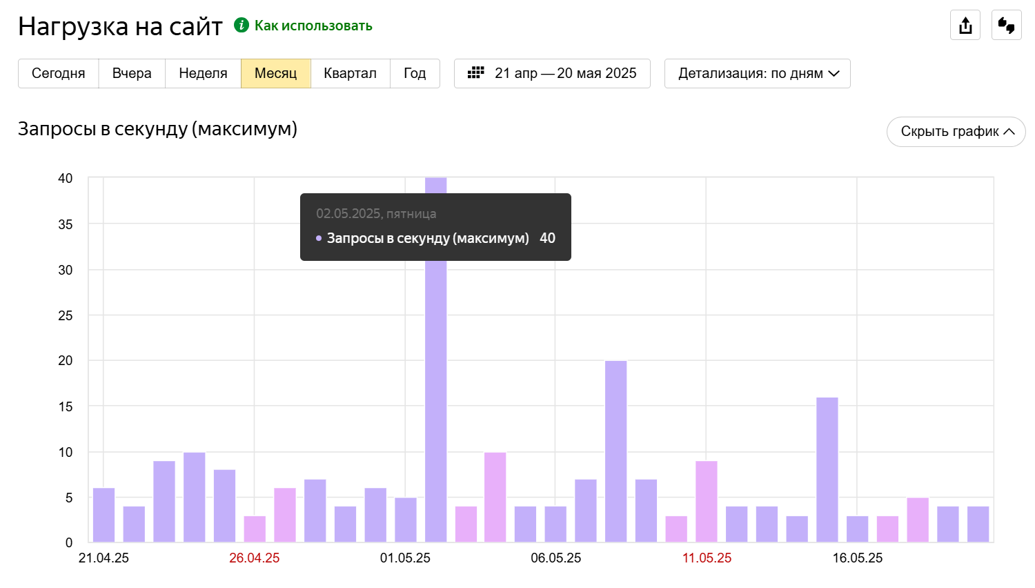 Если вы заметили, что сайт начал медленно загружаться или часто отвечать HTTP-кодом 500, вы можете проверить, кто совершает большинство запросов — посетители или роботы.