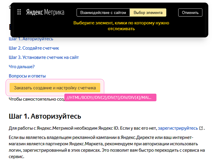 Вы можете настроить достижение цели по кликам на различные кнопки и ссылки на вашем сайте. При создании цели Метрика сохраняет информацию о расположении и свойствах этих элементов.