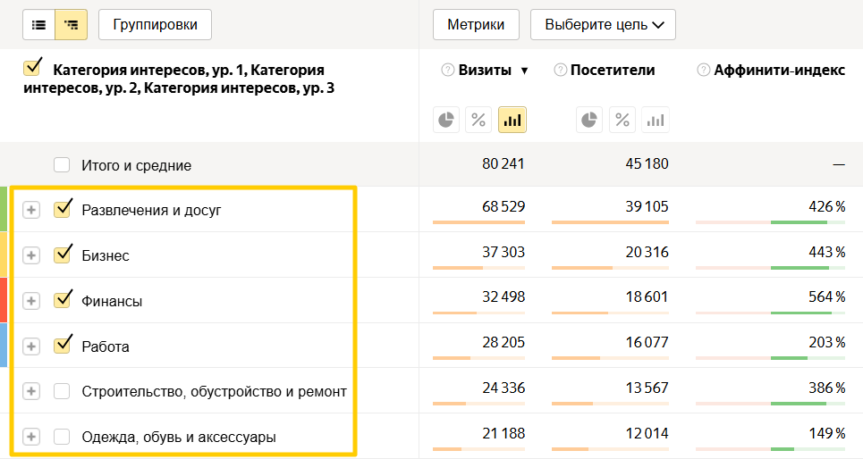 Сопоставив аффинити-индекс с другими показателями отчета (визитами, отказами, конверсией), вы можете определить предпочтения посетителей, которые конвертируются лучше всего.