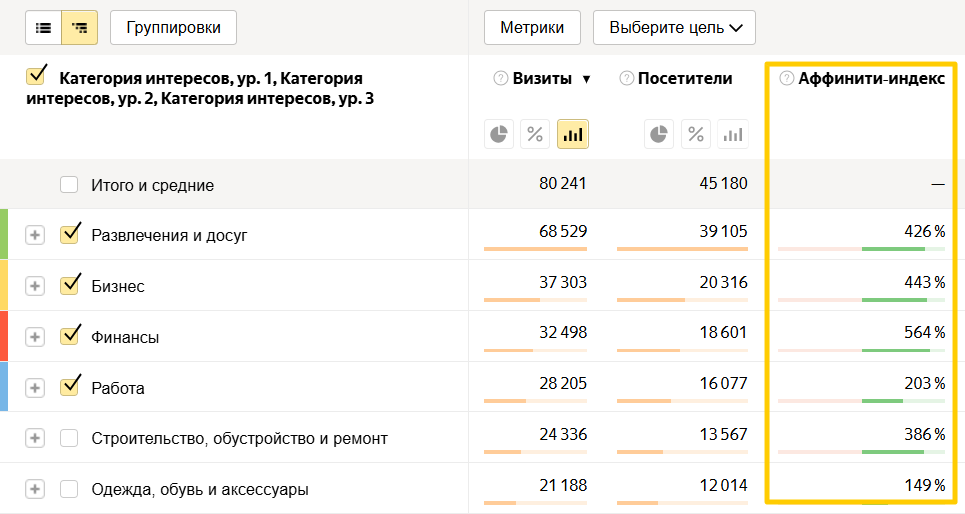 Для каждой тематики в отчете рассчитывается аффинити-индекс — показатель того, насколько сильно эта тематика интересует посетителей сайта по сравнению с аудиторией интернета в целом: