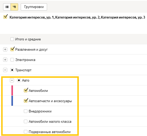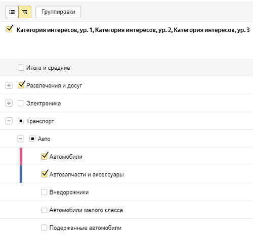 Данные в отчете объединены по категориям интересов посетителей. У некоторых категорий может быть до двух подуровней.