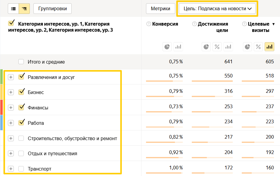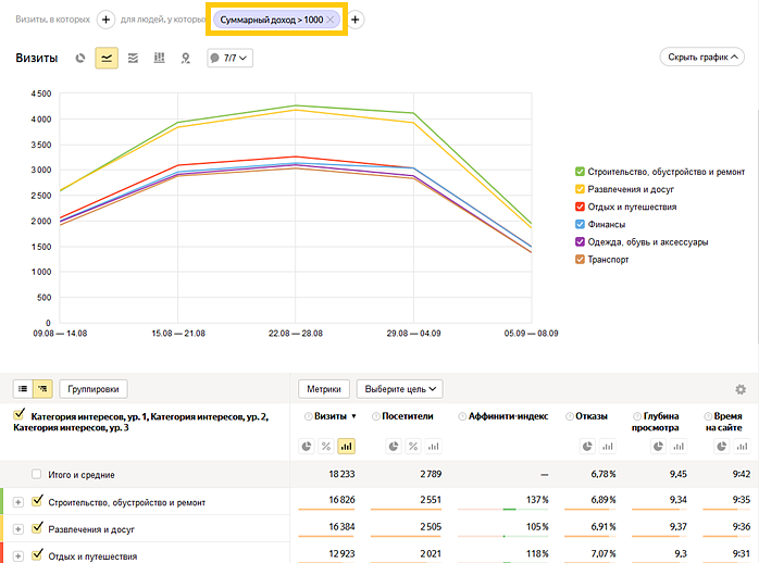 Отчет показывает, насколько та или иная тематика интересна посетителям вашего сайта, а также позволяет анализировать поведение посетителей на сайте в зависимости от их интересов.