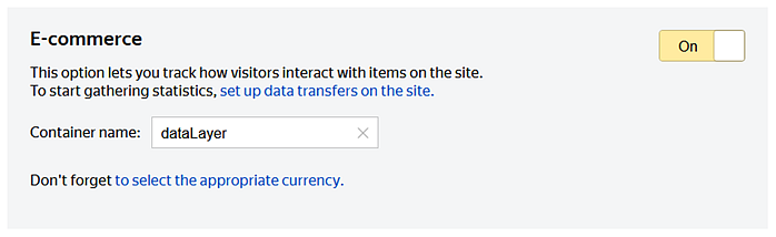 Sayaç ayarlarında E-ticaret seçeneğini etkinleştirin. Veri toplaması için sayaç koduna