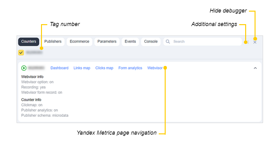 _ym_debug=2 parametresi yalnızca sitede yeni Yandex Metrica sayaç kodu yüklüyse çalışır. Önceki sayaç kodu yüklüyse veya hata ayıklama paneli belirmediyse, tarayıcı konsolunu kullanın.