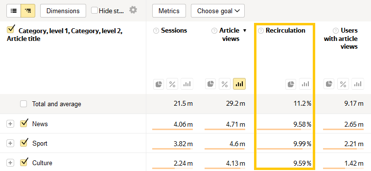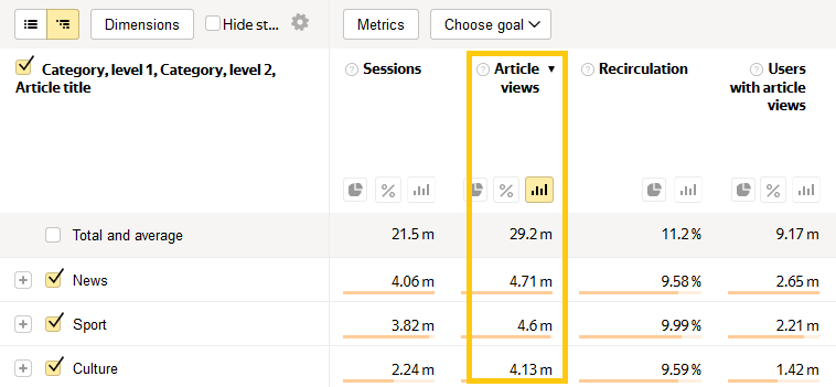 Rapor, Yandex Metrica'da kullanılabilen tüm ayarları destekler.