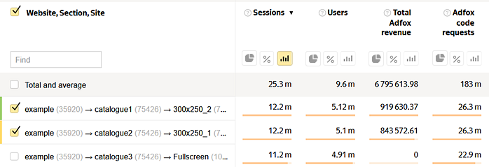 Adfox’ta ayarlanan reklam gösterimlerinden elde edilen geliri, sitenin veya sitenin bir bölümünün getirdiği geliri ve reklam bloğu formatını izleyebilirsiniz. Kolaylık sağlamak için verileri “Adfox Toplam Geliri” azalan sırasına göre sıralayın.