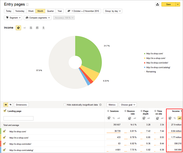 E-ticaret metrikleri ve oluşturduğu gruplar (boyutlar) diğer Metrica raporlarında da kullanılabilir. Örneğin, en fazla gelir getiren ziyaretlerin sitenin hangi sayfalarından başladığını bu şekilde belirleyebilirsiniz.