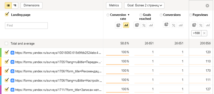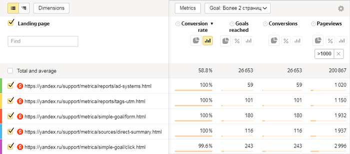 Bir örnek daha verelim: Dönüşümlerle sonuçlanan ziyaretlerin genellikle başladığı site sayfalarını bulmamız gerektiğini düşünelim. İlk bakışta görev çok basit görünüyor: Giriş sayfaları raporunu açıyor, uygun hedefi seçiyor ve raporu “dönüşüme göre” sıralıyoruz.
