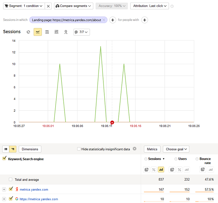 Rapor, Yandex Metrica'da kullanılabilen tüm ayarları destekler.