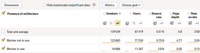 Bu rapor, cihazlarında en yaygın reklam engelleyicilerini kullanan ziyaretçilerin ziyaretleri hakkında bilgi verir: Adblock, Adblock Plus, Adguard, uBlock ve diğerleri. Bazı uygulamalar, Yandex Metrica sayacının kendisini de engelleyebilir. Bu yüzden, istatistiksel göstergeler gerçek istatistiklerden daha az görünebilir.